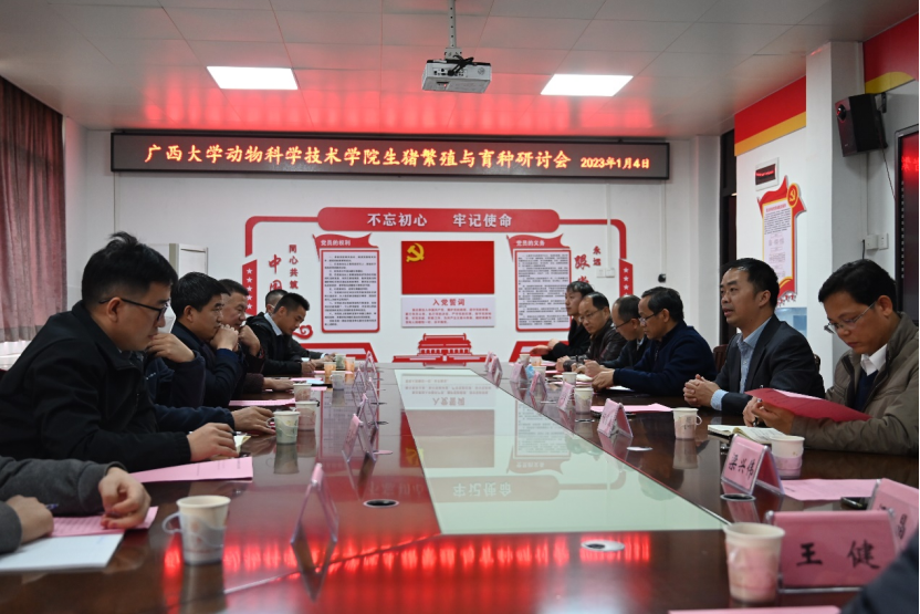 2023年1月4日,新年伊始,在动科院302会议室举办了“2022生物资源保护与利用国际产学研用合作会议”的主题研讨会“生猪繁殖与育种研讨会”。参加研讨会人员有动科院领导陆阳清常务副经理、何家康副经理、韦祖樟副经理及骨干教师,河南守望之境科技有限公司创始人刘洪波博士,区内养猪企业育种主要负责人赵云翔、司景磊、何昭友等,大家围绕生猪繁殖与育种主题,分别从繁殖育种、饲料营养、疫病防控、生产管理角度展开了热烈讨论。