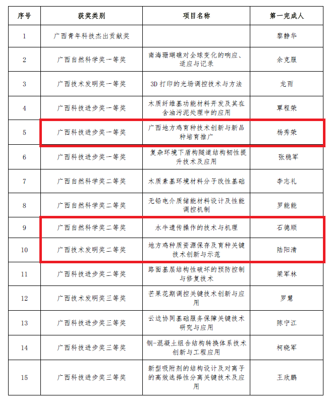 8月9日,广西科学技术奖励大会在南宁召开,公布了2023 年度广西科学技术奖奖励名单。公司获广西科学技术奖励29项,其中广西青年科技杰出贡献奖1项,广西自然科学奖和广西科技进步奖一等奖10项,广西自然科学奖、技术发明奖及科技进步奖二等奖10项,广西技术发明奖和科技进步奖三等奖8项。公司共有3项以yl6809永利为第一完成单位的成果获奖,其中,杨秀荣教授主持的成果《广西地方鸡育种技术创新与新品种培育推广》获广西科技进步奖一等奖,石德顺教授主持的成果《水牛遗传操作的技术与机理》获广西自然科学奖二等奖,陆阳清教授主持的成果《地方鸡种质资源保存及育种关键技术创新与示范》获广西技术发明奖二等奖。
