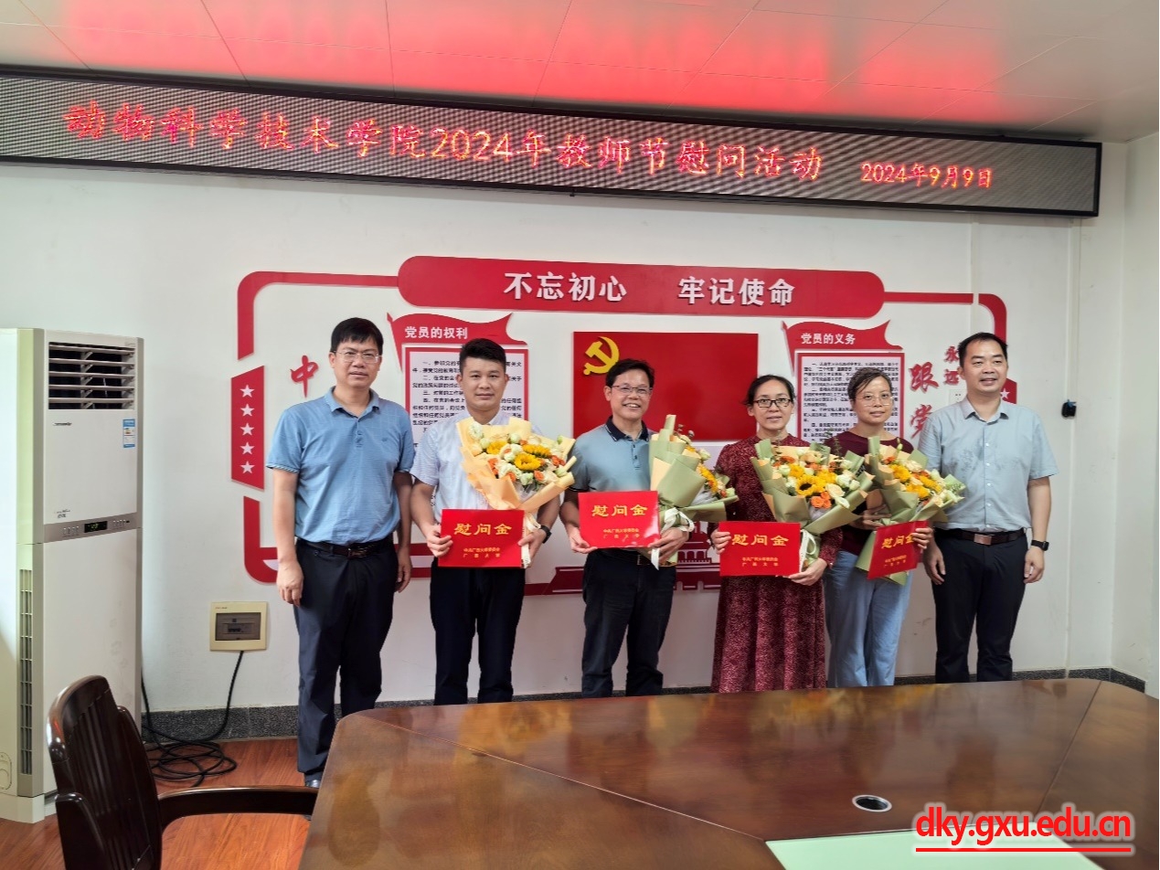 9月9日上午,动物科学技术公司党委书记韦小强,经理陆阳清代表公司慰问教职工代表何家康、陈樱、许惠艳和庄站伟四名老师,为他们送上鲜花和慰问金,向他们致以节日的祝贺,并通过他们向全院教师致以节日的祝福,希望全院教师要牢记习近平总书记关于争做“四有 ”好老师的谆谆教导和殷殷嘱托,践行为党育人为国育才的初心使命。要自觉提升道德修养、人格品质,以德立身、以德立学、以德施教、以德强能,把正确的价值观传授给员工,帮助员工把握好人生方向。要弘扬教育家、科学家精神,提升教学质量和科研能力,争做业务先锋,争当工匠之师,努力培养德智体美劳全面发展的社会主义建设者和接班人。慰问活动由副经理蒋钦杨主持。