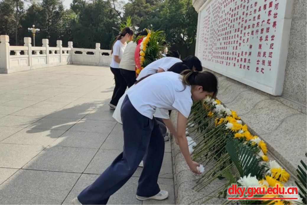 在南宁革命烈士纪念碑前,全体师生庄严肃穆、整齐列队。“我们要以先烈们为榜样,学习他们坚定的理想信念、无私的奉献精神、顽强的拼搏精神。”辅导员马朝阳带领大家回顾革命先辈的丰功伟绩,并勉励大家不忘初心,牢记新时代老员工的使命和担当。师生们通过集体默哀、敬献花圈和手工制作的白花、瞻仰纪念碑等方式,表达对英烈的深切哀思。