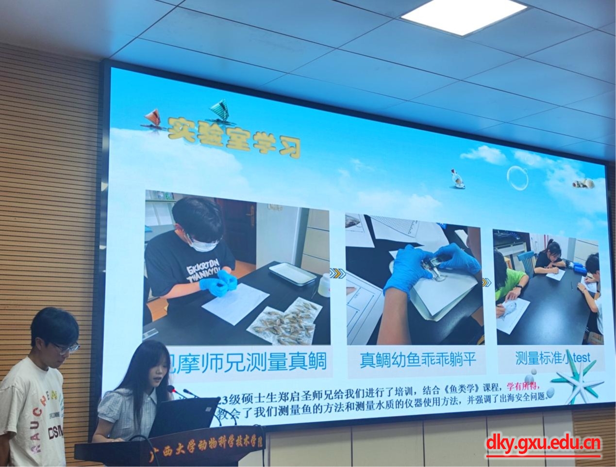 2022级动物科学专业水产养殖方向何彦莹、黄思恺同学分享他们参与实验室的科研学习和出海的趣味体验。