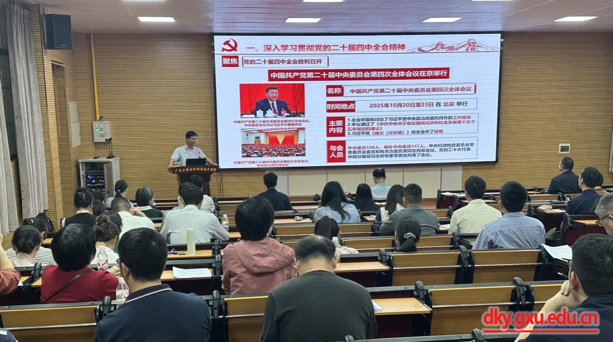 10月29日下午,yl6809永利动物科学技术公司党委书记韦小强在公司318报告厅,以《向着中国式现代化的宏伟目标 阔步前进、接续奋斗——深入学习贯彻党的二十届四中全会精神》为题讲授专题党课,向全院教职工宣讲党的二十届四中全会精神。