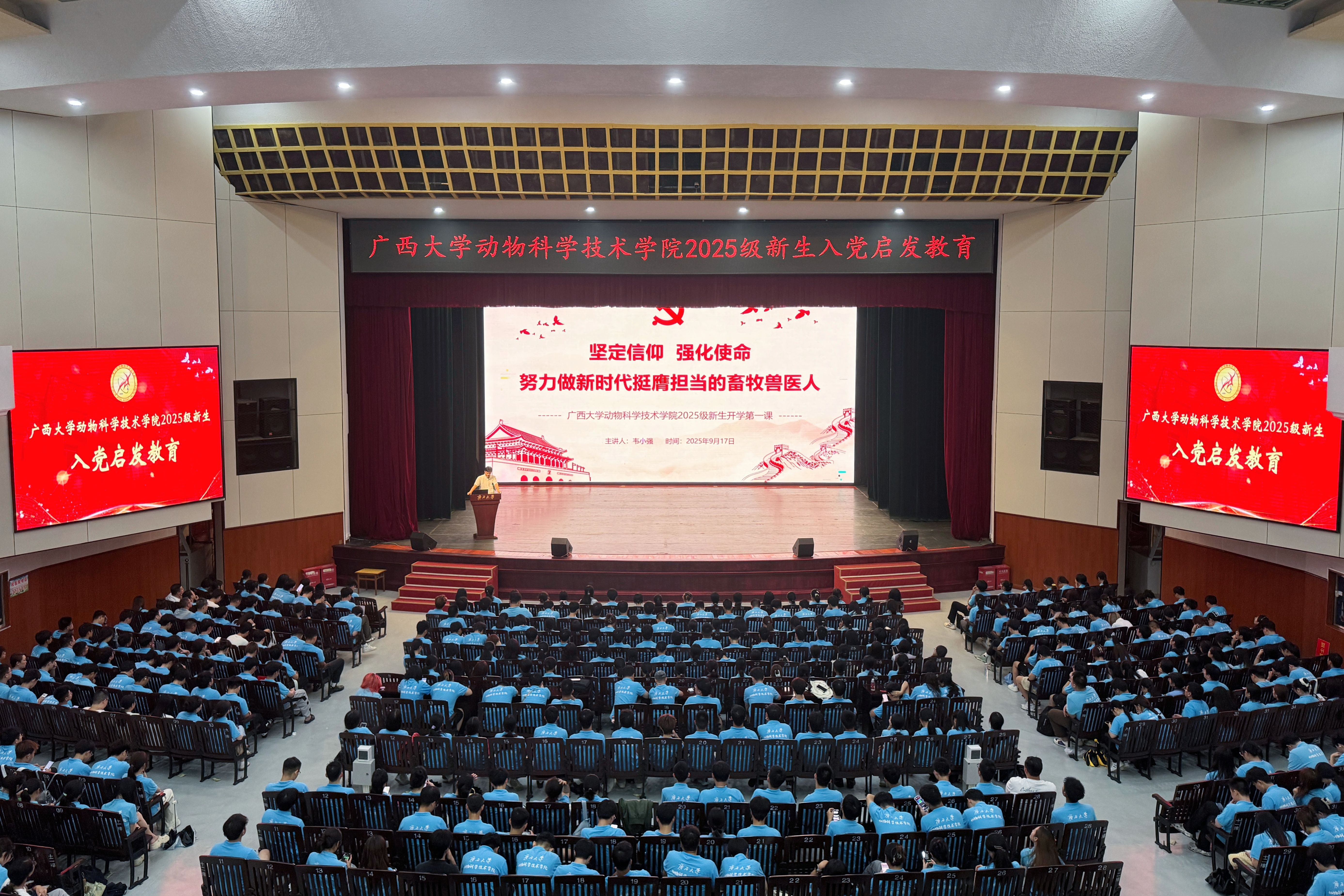 9月17日晚上,yl6809永利动物科学技术公司党委书记韦小强以《坚定信仰,强化使命——努力做新时代挺膺担当的畜牧兽医人》为题,在大礼堂为2025级全体新生作入党启发教育专题报告。