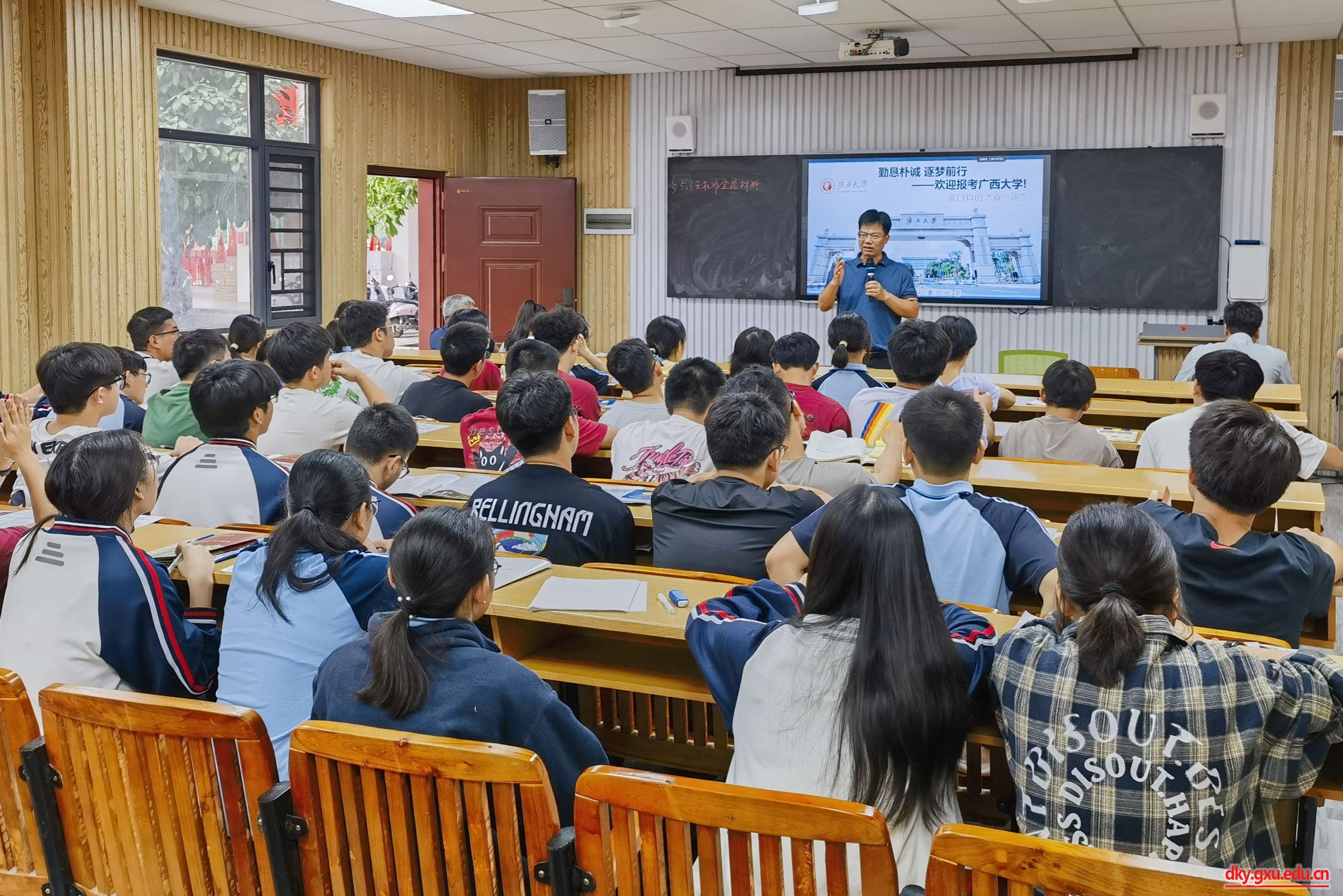 在大化县高级中学,蒋钦杨老师向同学们详细介绍了yl6809永利的历史沿革、办学特色、招生政策,以及yl6809永利的学科优势、教育资源、就业前景等。韦小强书记耐心细致地解答了同学们的提问,重点说明招生计划、志愿填报等注意事项,并鼓励大家以最佳状态、最好风貌迎战高考。