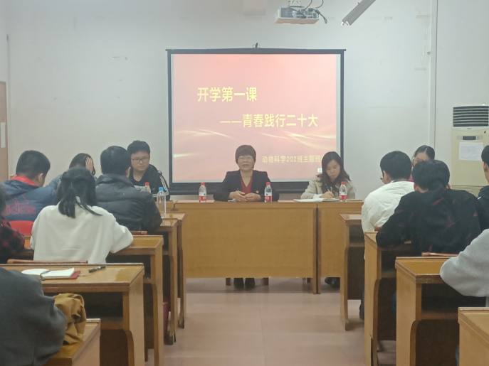 2023年2月20日晚7:30,动物科学202班在动物繁殖研究所一楼会议室开展“开学第一课——青春践行党的二十大”主题班会。本次班会由班主任黄洁萍老师主持,学公司党委书记顾慕娴老师、团委书记李丽娜老师及2名研究生受邀参加班会。 首先,黄洁萍老师回顾了上一学期班级同学取得的成绩和存在的不足,引导同学们尽早树立目标,对自己的大学时光做好规划。同时,邀请2名研究生为大家介绍考研的院校选择、复习准备等经验。 李丽娜老师就动物科学专业的就业前景与趋势作了分析,鼓励同学们坚定专业自信、筑牢理论基础、积极参与科研、勇于实习实践,为将来顺利升学就业做好准备。