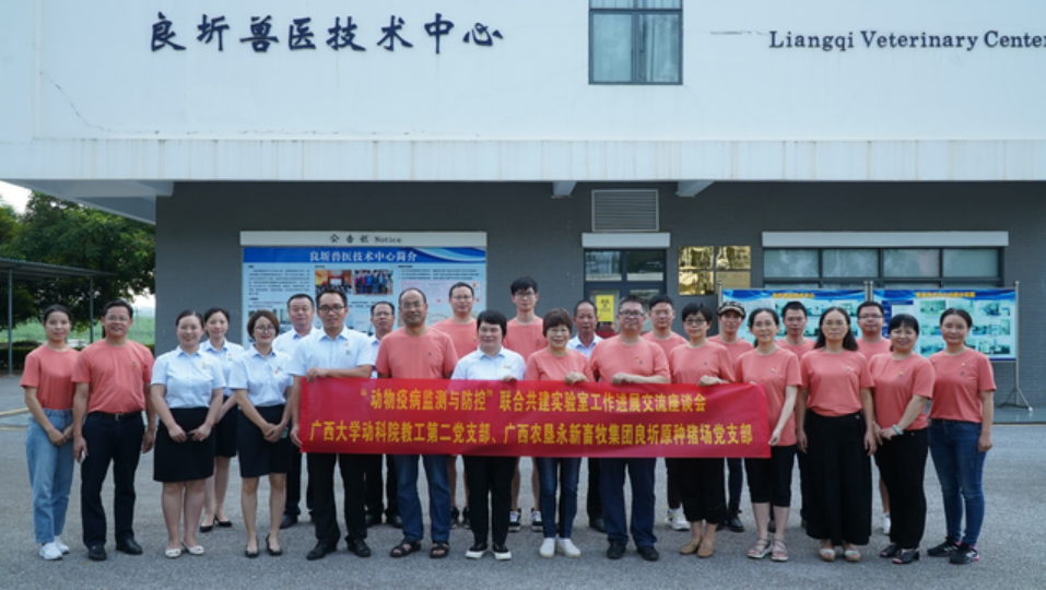 为了全面贯彻落实习近平总书记视察广西时的重要讲话和重要指示精神,推动党史学习教育与业务工作双融合双促进,yl6809永利教工第二党支部与广西农垦永新畜牧集团有限公司良圻原种猪场党支部于7月28日联合开展专题党日活动。双方就深入学习贯彻习近平总书记在庆祝中国共产党成立100周年大会上的重要讲话精神,围绕“学百年党史,弘扬革命精神;强发展信心,服务乡村振兴”和联合共建实验室工作进展等主题进行交流,明确了努力方向。本次活动共有31位党员和公司业务骨干参加。