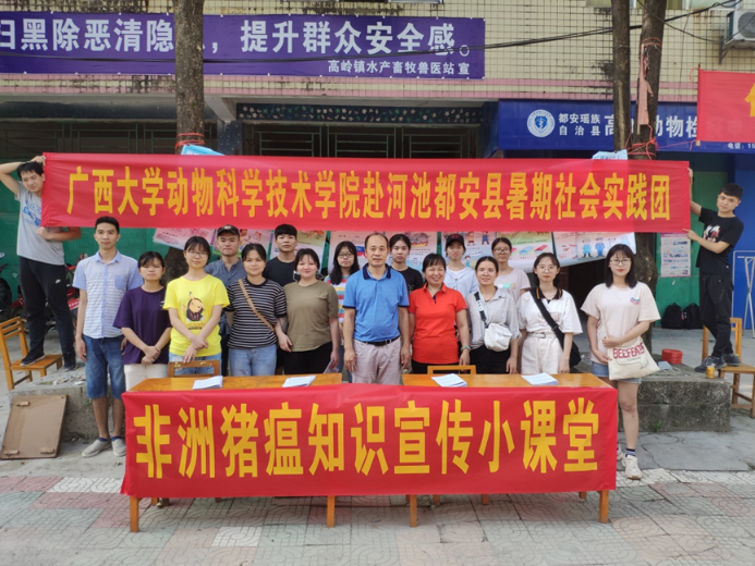 20日上午,社会实践团到都安县高岭镇开展非洲猪瘟知识小课堂的宣传活动。
