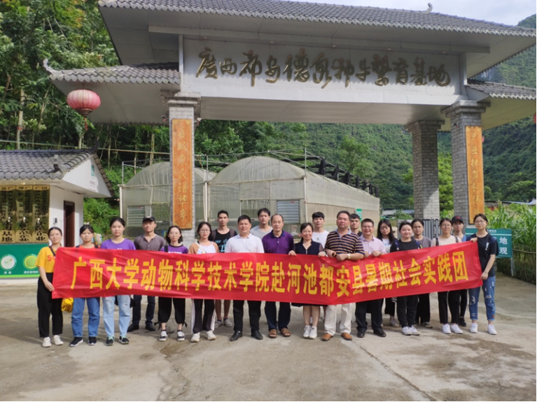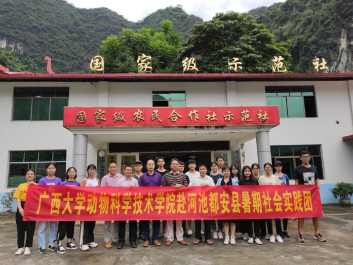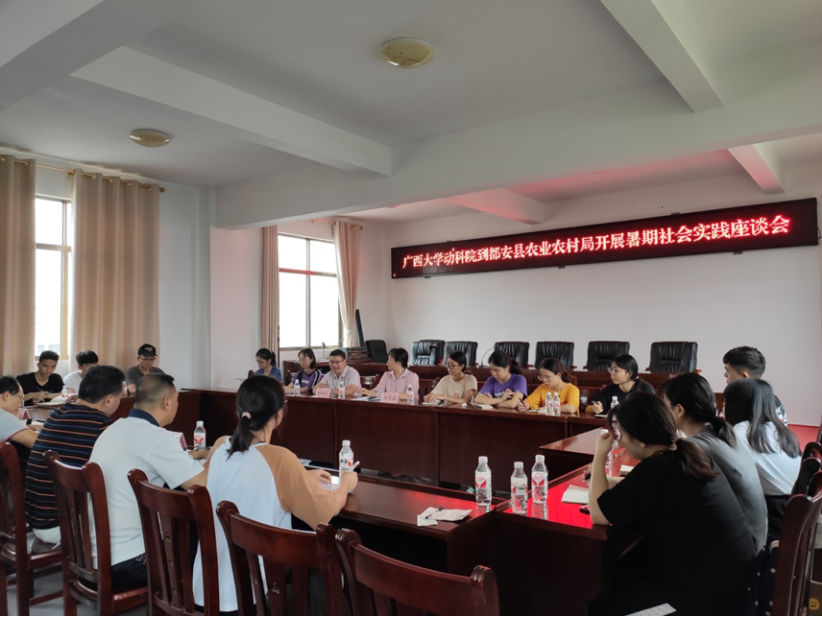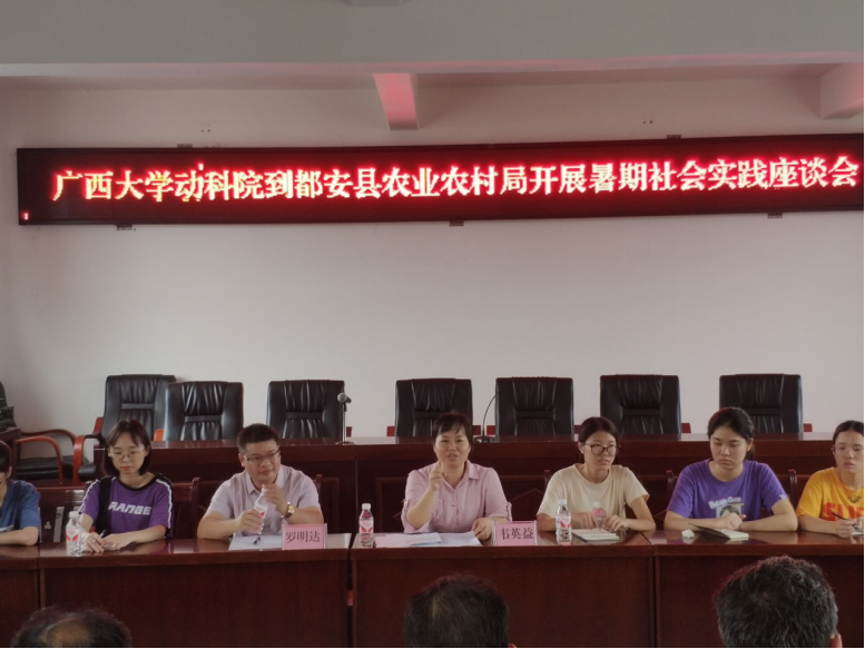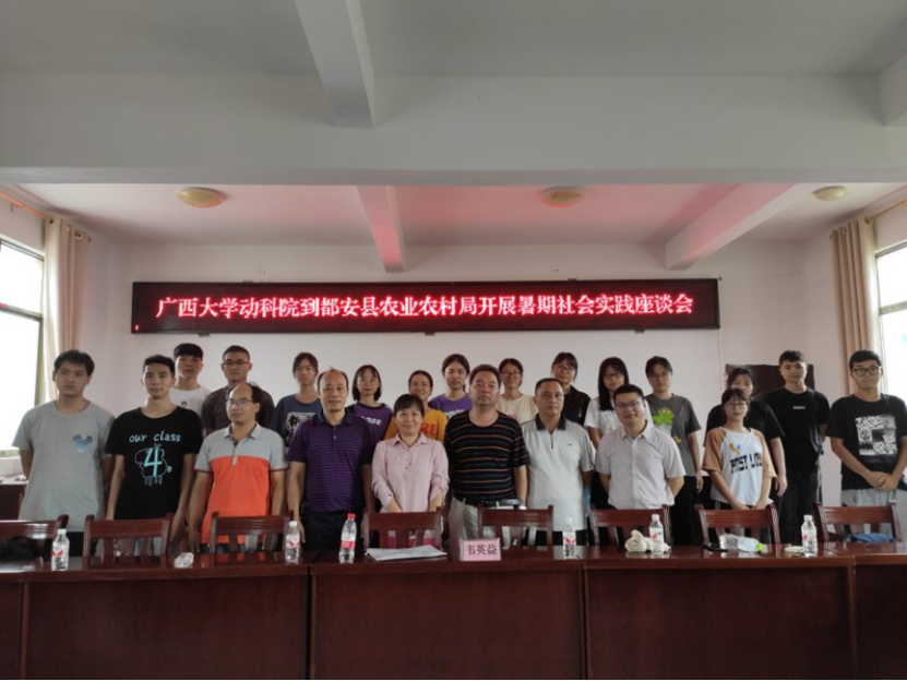 2019年7月19-20日,由韦英益同志指导带领的yl6809永利赴河池市都安县暑期社会实践团成员共18位动医2017级同学到都安县开展暑期社会实践活动。19日社会实践团全体成员与都安县水产畜牧兽医局的领导和技术员开展了关于“都安县畜牧业养殖现状及贷牛(羊)还牛(羊)特色扶贫模式”为主题的座谈会,韦海峰副局长、县防控中心陆高天主任和王兰芳副主任、县动监所韦生力副所长、牛羊产业中心石清柏主任以及兽医站站长、广西黑猪养殖学会罗明达会长等参加本次座谈会。