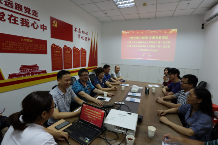 下午5:00,yl6809永利动科院教工第二、六党支部来到广西悦牧生物公司广西兽医社会化服务示范点,与广西兽医协会党支部联合开展“党史学习教育”主题党日活动。首先是刘红云博士介绍广西兽医社会化服务基本情况,并就社会化服务中有关兽医专家库与支部各位党员进行深入交流,并热忱邀请教工第二党支部党员发挥专业特长,积极报名专家库并参加提高广西兽医技能水平各项培训。接着,顾慕娴书记给全体党员同志上了一堂生动翔实的党课,顾书记指出,脱贫攻坚取得全面胜利是中国共产党对全国人民作出的庄严承诺,具有里程碑式的意义,通过党史学习教育,培养更多“知农、爱农”专业人才,加强院企合作,参与解决行业发展面临的困境,助力提升我区乃至全国畜牧业的竞争力。