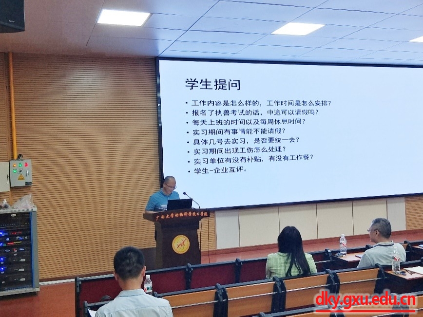 在会议中,皇氏畜牧公司蒋吉燕女士详细介绍了企业文化、休假管理、员工成长等方面内容;河池雪花牛公司覃潘先生介绍了企业发展概况、产业规模、发展计划等内容;皇氏赛尔公司陈康露女士对公司发展,奶水牛项目进展,员工福利等内容进行了汇报;西江金光公司韦英将先生主要汇报了公司基本情况。丁嘉烽老师简要总结了各企业的发展情况,再次欢迎各实习企业的到来。师铭咸老师对实习要求给予了细致讲解,使同学们充分了解本次生产实习的纪律要求、安全保障、成绩考核,以及特殊情况处理等。会议最后,同学们与指导老师和实习单位进行了热烈的讨论。最后由副经理韦祖樟教授作会议总结发言。