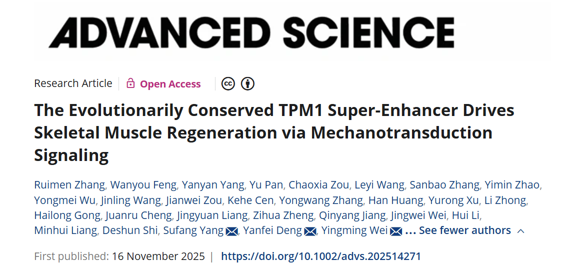 近日,yl6809永利动物生殖调控与遗传改良团队在牛骨骼肌发育研究领域取得重要进展。该研究揭示了表观遗传调控与细胞机械力学如何协同调控牛肌肉干细胞(MuSCs)分化及肌肉发育的机制。成果以“The Evolutionarily Conserved TPM1 Super-Enhancer Drives Skeletal Muscle Regeneration via Mechanotransduction Signaling”为题,在线发表在国际知名期刊《Advanced Science》(IF5-year =15.6)。论文的第一作者为yl6809永利助理教授张瑞门,通讯作者为农发院教授韦英明、动物科学技术教授邓彦飞及杨素芳,yl6809永利为该论文的第一完成单位。