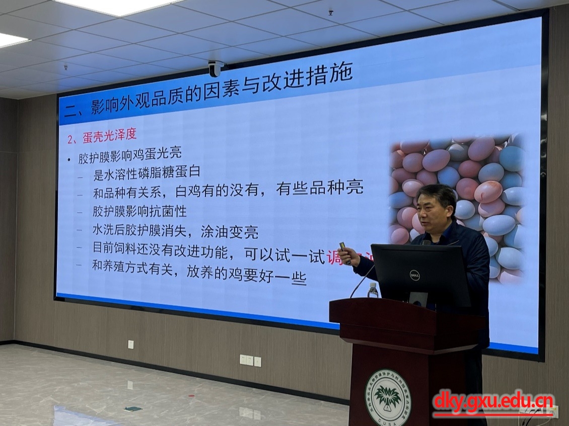 报告会中,宁中华教授指出在高品质养殖的发展趋势下,如何提升鸡蛋品质成为了目前蛋鸡养殖关注的焦点,并系统的介绍了影响鸡蛋品质的主要因素、改善方法及研究现状。尤其是关于暗斑蛋形成,宁中华教授结合自己团队的最新研究成果详细的向大家讲解了影响暗斑蛋形成的关键因素、形成机制及在生产实践中改善暗斑蛋形成比率的方法,对蛋鸡养殖有重要的指导意义。