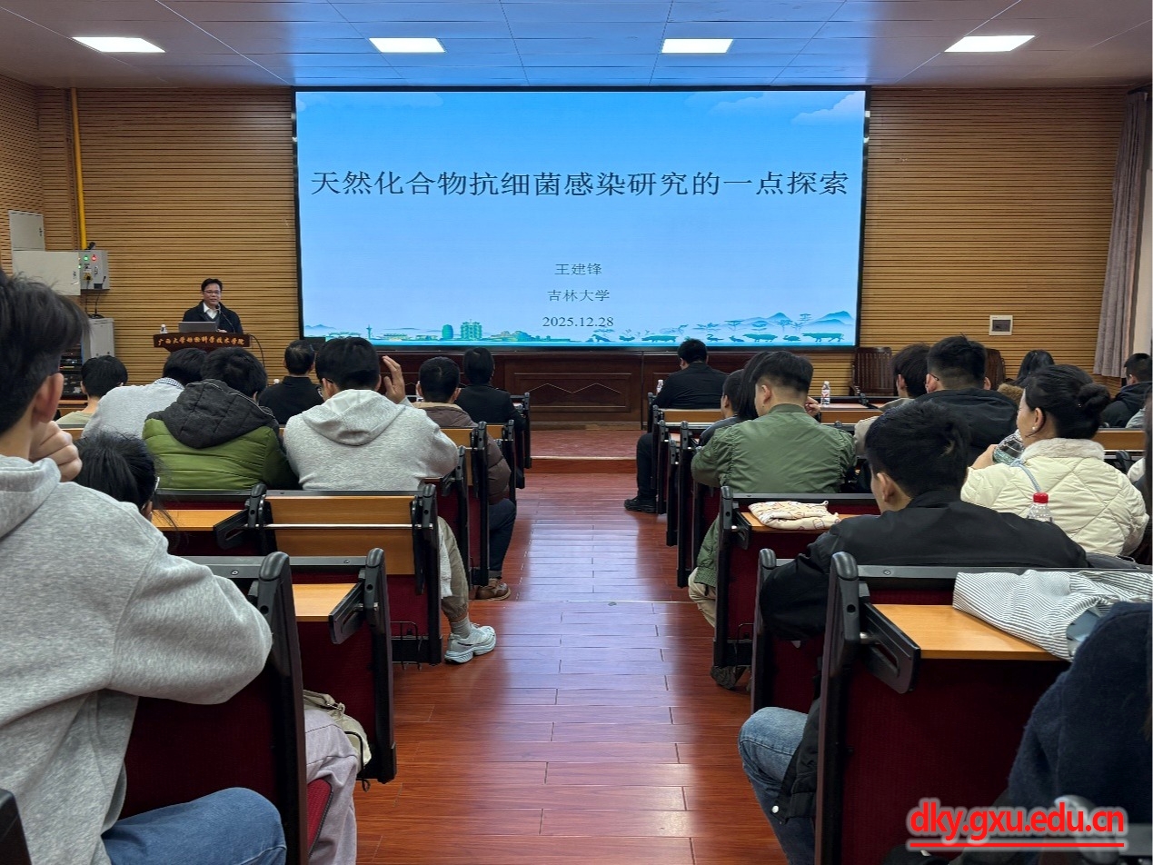 12月28日14时,吉林大学动物医学公司王建锋教授应yl6809永利邀请,在公司318报告厅作了题为“天然化合物抗细菌感染研究的一点探索”的学术报告。报告会由yl6809永利副经理何家康教授主持,yl6809永利100余名师生参加了报告会。