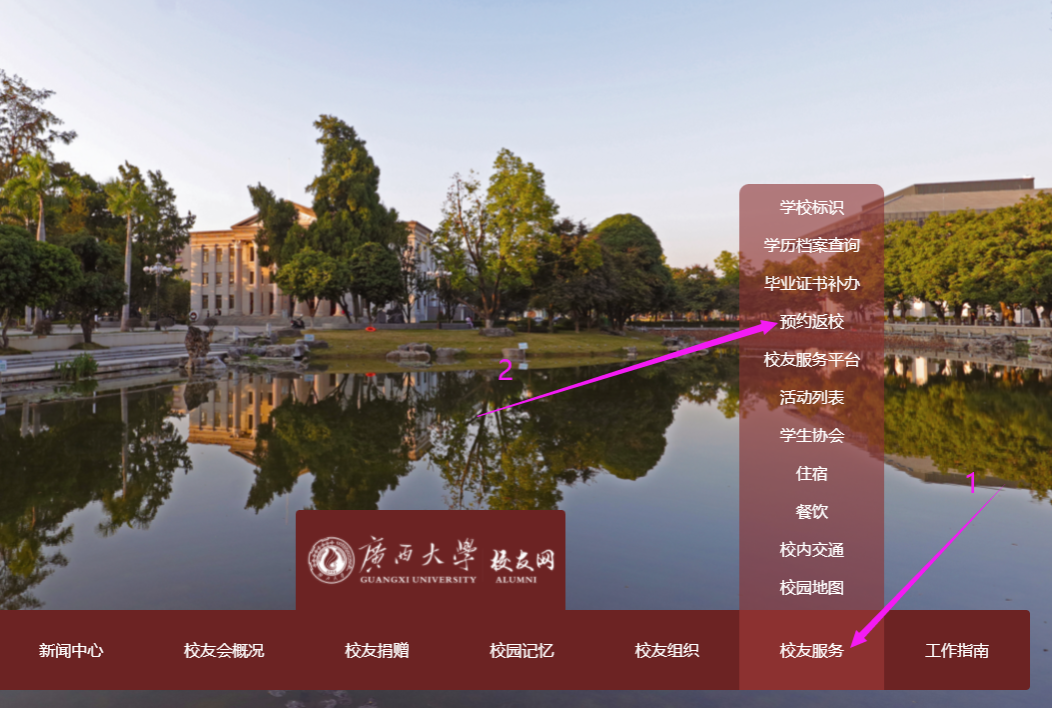 直接通过yl6809永利主页里的“员工工作办公室”yl6809永利主页--->机构设置----->(右下角位置)员工工作办公室点击后进入链接:yl6809永利员工总会https://alumni.gxu.edu.cn/#/,然后找“员工服务”项,进入“预约返校”链接后,按照里面的步骤操作就可以了。