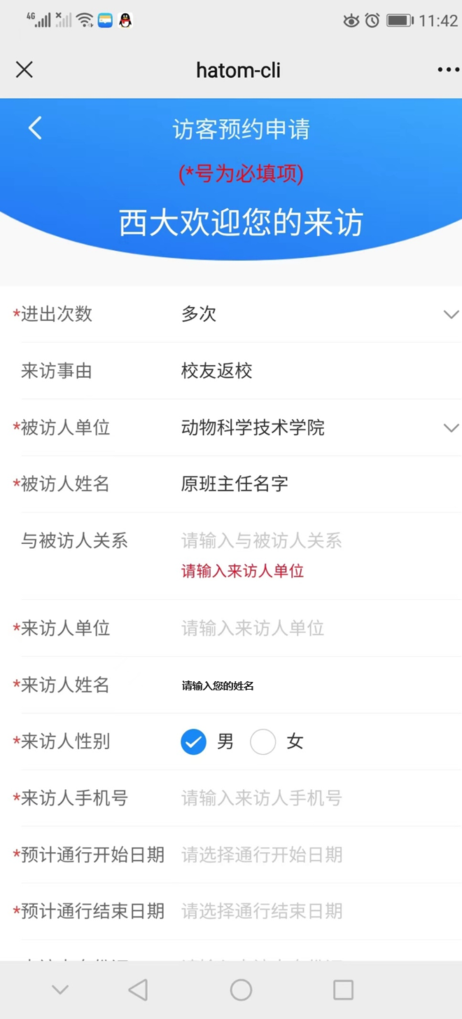 选择第一项“预约个人/单位申请”,弹出界面里,填写个人信息及来访理由、上传或者拍摄个人上半身照片等内容,填好后提交即可。